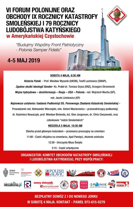 Obchody IX rocznicy Katastrofy Smoleńskiej oraz 79. Rocznicy Ludobójstwa Katyńskiego – „Polonia Semper Fidelis – Budujmy Wielki Front Patriotyczny” – odbędą się w dniach 4 -5 maja 2019 roku w Amerykańskiej Częstochowie – Narodowym Sanktuarium Matki Boskiej Częstochowskiej w Doylestown, Pennsylvania.