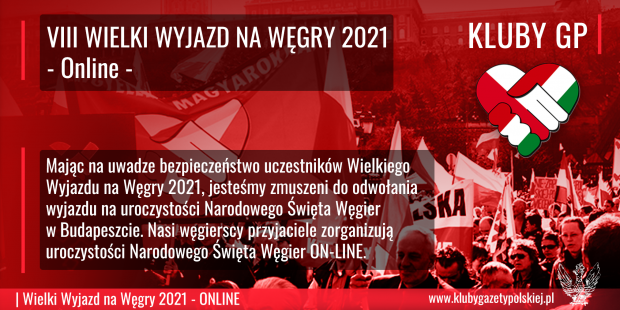 Mając na uwadze bezpieczeństwo uczestników Wielkiego Wyjazdu na Węgry 2021, jesteśmy zmuszeni do odwołania wyjazdu na uroczystości Narodowego Święta Węgier w Budapeszcie. Nasi węgierscy przyjaciele zorganizują uroczystości Narodowego Święta Węgier on-line.