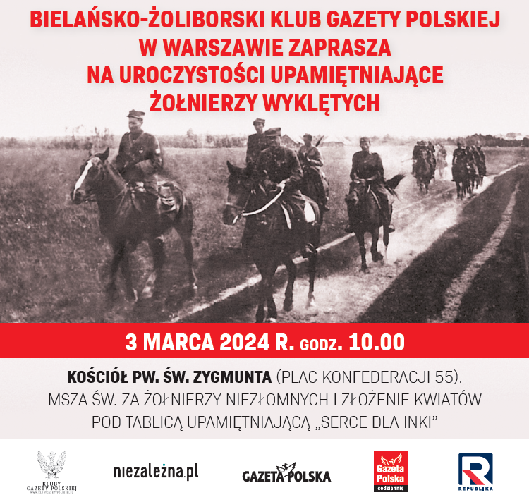 WARSZAWA BIELANY-ŻOLIBORZ – Zaproszenie na obchody Dnia Pamięci Żołnierzy Wyklętych. Msza w kościele pw. św. Zygmunta, pl. Konfederacji 55, 3 marca 2024 (niedziela), godz.10:00. Po Mszy Św. złożenie kwiatów pod tablicą upamiętniającej Danutę Siedzikównę ps. „Inka”.