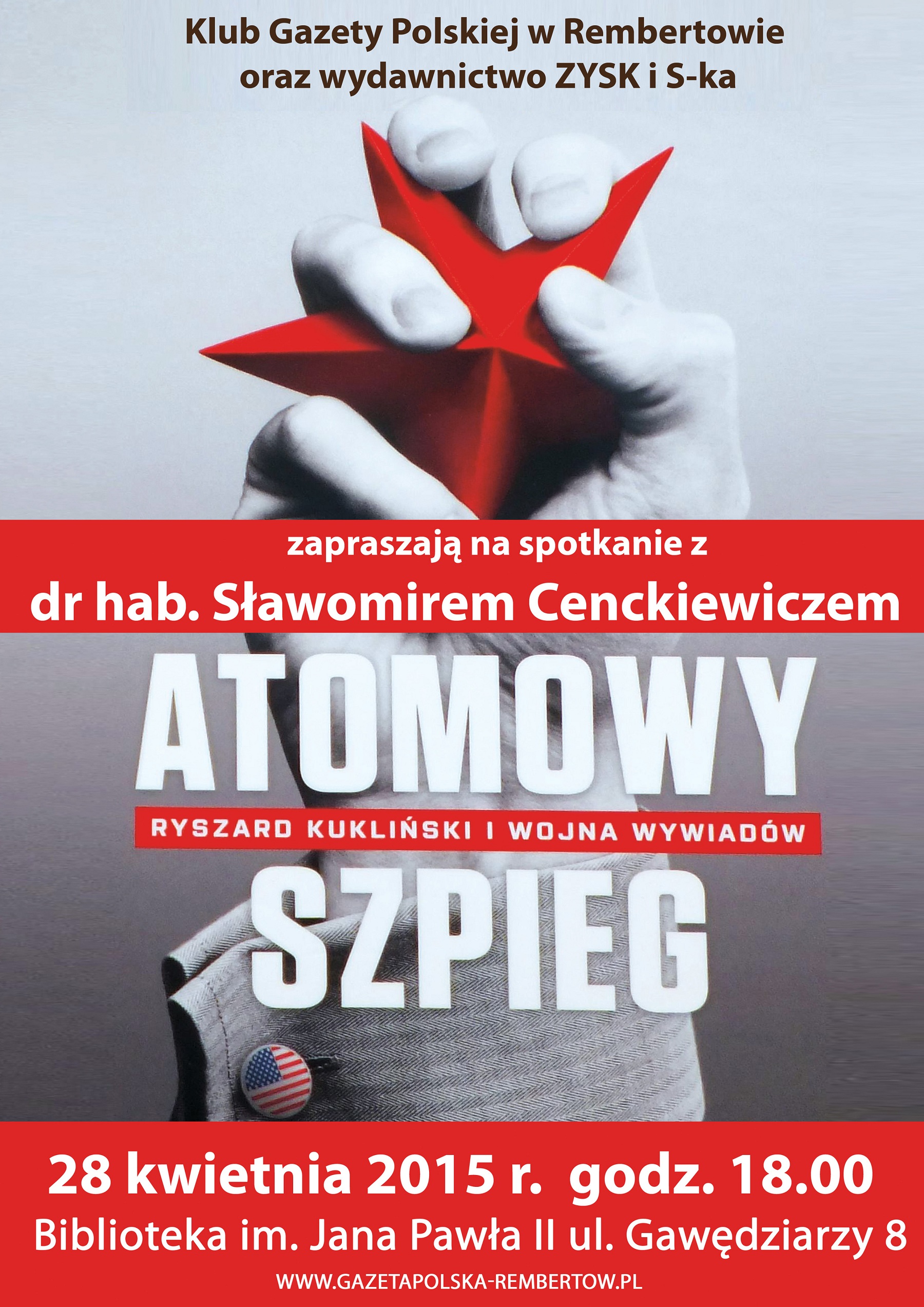 Warszawa Rembertów – spotkanie w klubie z dr hab. Sławomirem Cenckiewiczem. W trakcie spotkania prezentacja książki „Atomowy szpieg” połączona z dyskusją o roli płk. Ryszarda Kuklińskiego w historii przemian Europy Wschodniej i Polski, 28 kwietnia, g. 18, Biblioteka Publiczna ul. Gawędziarzy 8 (obok Ratusza w Rembertowie).