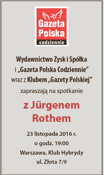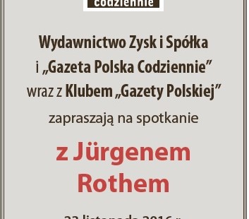 Warszawa – spotkanie z Jürgenem Rothem, 23 listopada, g. 19, Klub Hybrydy, ul. Złota 7/9. Zaprasza Klub „GP”, Wydawnictwo Zysk i Spółka, Gazeta Polska Codziennie.