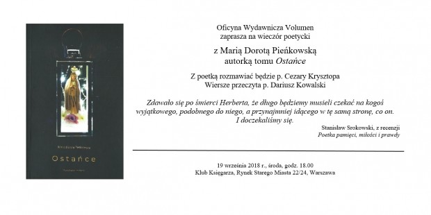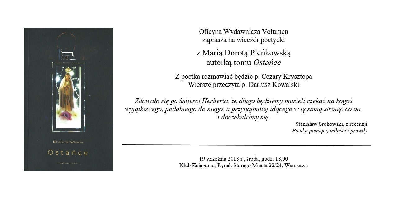 Warszawa – wieczór poetycki z Marią Dorotą Pieńskowską autorką tomu pt.” Ostańce”, 19 września, g. 18, Klub Księgarza, Rynek Starego Miasta 22/24. Zaprasza Oficyna Wydawnicza Volumen.