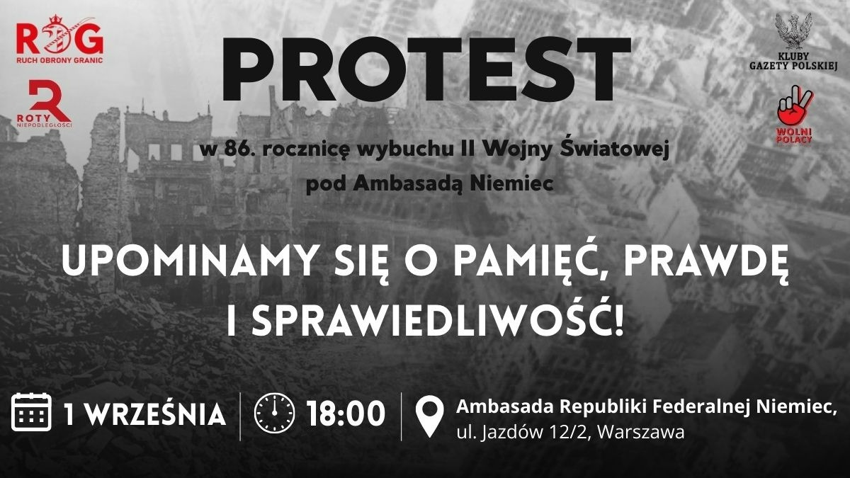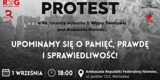 zaprasza na protest w 86. rocznicę wybuchu II Wojny Światowej pod Ambasadą Niemiec pt. „Upominamy się o pamięć, prawdę i sprawiedliwość!”,