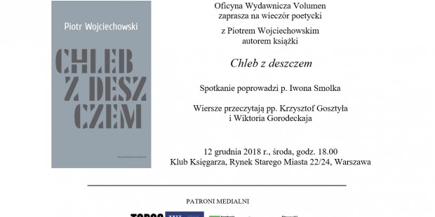 Zaproszenie do Klubu Księgarza, na spotkanie z p. Piotrem Wojciechowskim, autorem wydanej w Oficynie Wydawniczej Volumen książki Chleb z deszczem. 12 grudnia godz. 18;00.Klub Księgarza, Rynek Starego Miasta 22/24 Warszawa