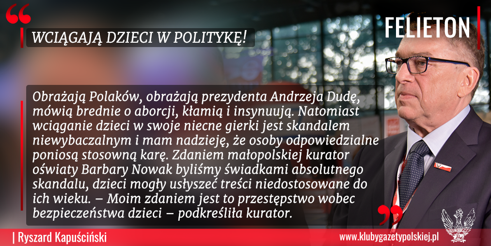 Po raz kolejny „nadzwyczajna kasta” dała znać o sobie, organizując w wielu miastach happeningi pod nazwą „Tour de Konstytucja”. Współorganizatorami są tak „zacne” organizacje, jak m.in.: KOD, Strajk Kobiet, Protest z Wykrzyknikiem, Wolne Sądy czy stowarzyszenia sędziowskie i prokuratorskie. Happeningi gromadzą od kilku do kilkunastu przypadkowych przechodniów, dlatego z braku chętnych do wysłuchiwania głupot i kłamstw, np. sędziego Żurka, Tulei czy prokuratora Laszczaka, do udziału w tych skandalicznych imprezach zaprasza się dzieci w wieku przedszkolnym i szkolnym. Taka sytuacja miała miejsce np. w Dobczycach, a później w Myślenicach. Szkoda przytaczać wypowiedzi organizatorów tych spotkań, mówią to samo od wielu lat. Obrażają Polaków, obrażają prezydenta Andrzeja Dudę, mówią brednie o aborcji, kłamią i insynuują. Natomiast wciąganie dzieci w swoje niecne gierki jest skandalem niewybaczalnym i mam nadzieję, że osoby odpowiedzialne poniosą stosowną karę. Zdaniem małopolskiej kurator oświaty Barbary Nowak byliśmy świadkami absolutnego skandalu, dzieci mogły usłyszeć treści niedostosowane do ich wieku. – Moim zdaniem jest to przestępstwo wobec bezpieczeństwa dzieci – podkreśliła kurator.