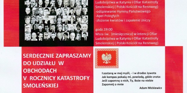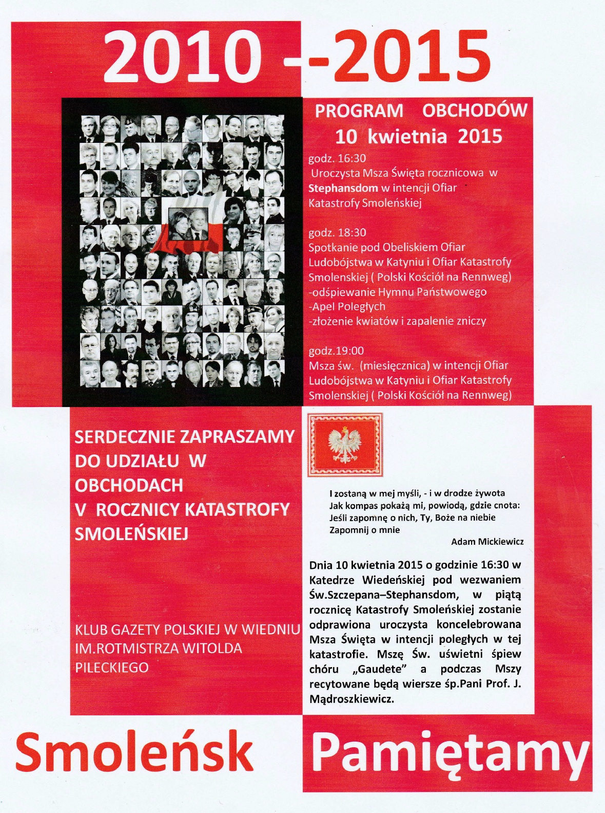 Wiedeń II – Msze św. w intencji Ofiar tragedii smoleńskiej, 10 kwietnia Zapraszamy na uroczystą Mszę Św.w intencji Ofiar Katastrofy Smoleńskiej do Katedry Wiedeńskiej – Stephansdom, która odbędzie się 10 kwietnia 2015 roku o godzinie 16:30. Klub „Gazety Polskiej” im.W. Pileckiego w Wiedniu. kw. 8, 2015 Kluby GP Wiedeń II (Austria) Tagged Marsz, Obchody, Tragedia Smoleńska, Wiedeń II (Austria) Wstecz Opole – V rocznica tragedii smoleńskiej, 10 kwietnia Dalej Odsłonięcie tablicy smoleńskiej w Gnieźnie – 11 kwietnia.
