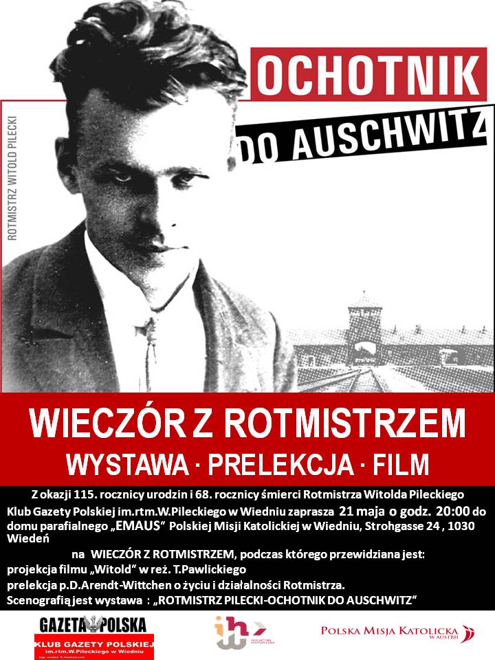 Klub GP im. rtm. W. Pileckiego w Wiedniu organizuje w Centrum Parafialnym PMK EMAUS, Strohgasse 24 1030 Wiedeń, 21 maja o godz. 20.00 „Wieczór z Rotmistrzem”.