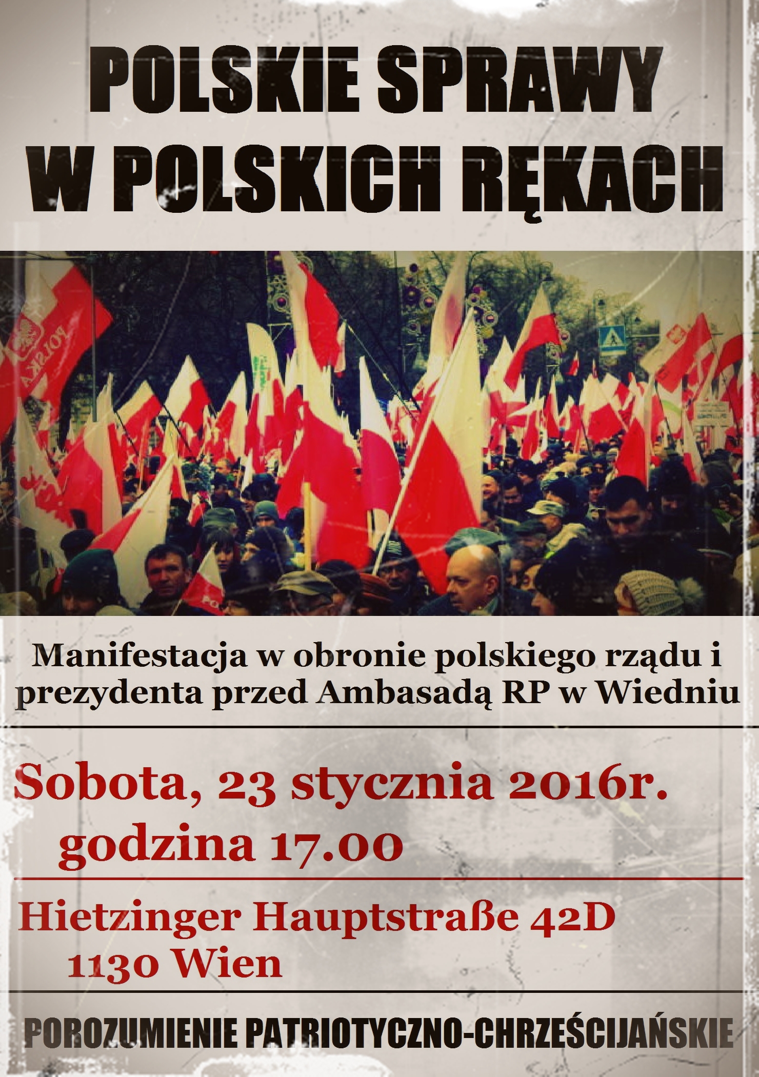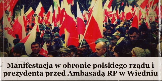 W najbliższą sobotę, 23 stycznia br., o godz. 17 odbędzie się przed budynkiem Ambasady RP w Wiedniu (Hietzinger Hauptstr. 42C, 1130 Wiedeń) manifestacja w obronie rządu i prezydenta RP. Klub GP im. rtm. W. Pileckiego, jako członek Porozumienia Patriotyczno-Chrześcijańskiego, jest współorganizatorem demonstracji. Zapraszamy wszystkich Polaków, którym sprawy Polski nie są obojętne.