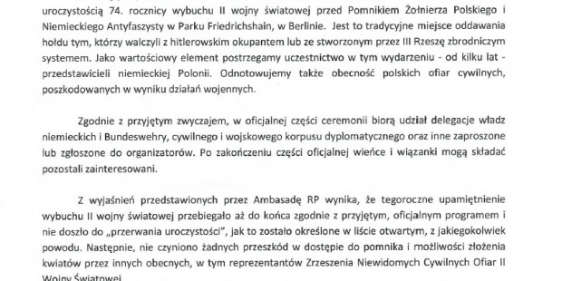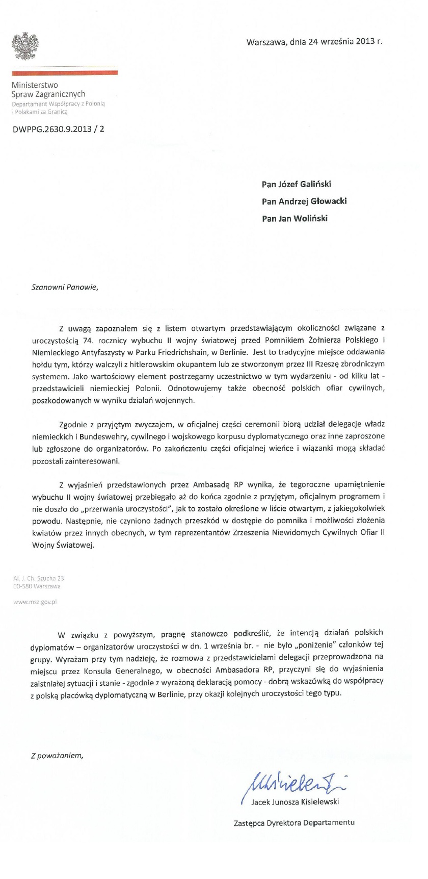 Niniejszym zawiadamiamy Ministra Spraw Zagranicznych pana Radosława Sikorskiego i Ministra Obrony Narodowej pana Tomasza Siemoniaka o świadomym poniżeniu w czasie uroczystości obchodów 74. rocznicy wybuchu II Wojny Światowej – napadu Niemiec – Trzeciej Rzeszy- na Rzeczypospolitą Polską – która odbyła się 1 września 2013 r. przed Pomnikiem Żołnierza Polskiego i Niemieckiego Antyfaszysty w Berlinie, wymienionych poniżej uczestników uroczystości…