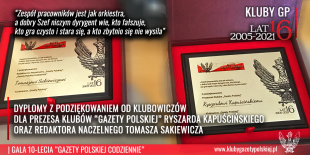 Wręczenie dyplomów dla Prezesa Ryszarda Kapuścińskiego oraz Red.Nacz. Tomasza Sakiewicza na 16-lecie Klubów „Gazety Polskiej” oraz podziękowania od Klubowiczów.