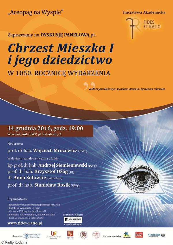 Wrocław, 14 grudnia o godz. 19:00 „Chrzest Mieszka I i jego dziedzictwo w 1050. rocznicę wydarzenia” – dyskusja panelowa w auli Papieskiego Wydziału Teologicznego pl. Katedralny 1. Moderator: prof. dr hab. Wojciech Mrozowicz, Uczestnicy: bp prof. dr hab. Andrzej Siemieniewski, prof. dr hab. Krzysztof Ożóg, dr Anna Sutowicz, prof. dr hab. Stanisław Rosik.