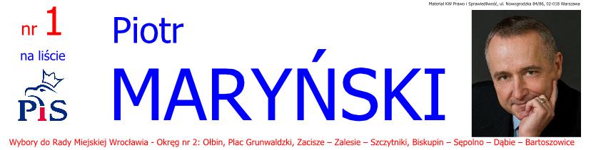 Na spotkanie zaprasza Piotr Maryński – kandydat Klubu GAZETY POLSKIEJ do Rady Miejskiej Wrocławia – nr 1 na liście Prawa i Sprawiedliwości Okręg nr 2: Ołbin, Plac Grunwaldzki, Zacisze – Zalesie – Szczytniki, Biskupin – Sępolno – Dąbie – Bartoszowice