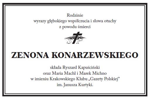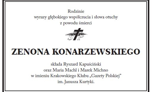 Wyrazy głębokiego współczucia i słowa otuchy… Rodzinie wyrazy głębokiego współczucia i słowa otuchy z powodu śmierci ś.p. Zenona Konarzewskiego składa Ryszard Kapuściński oraz Maria Machl i Marek Michno w imieniu Krakowskiego Klubu „Gazety Polskiej” im. Janusza Kurtyki sie 5, 2016 Kluby GP Kraków, Kraków - Klub Młodych "GP", Kraków - Nowa Huta Tagged Kraków, nekrolog Wstecz Ostatnia droga kardynała Franciszka Macharskiego (wideo) Dalej Wielkie rozczarowanie?