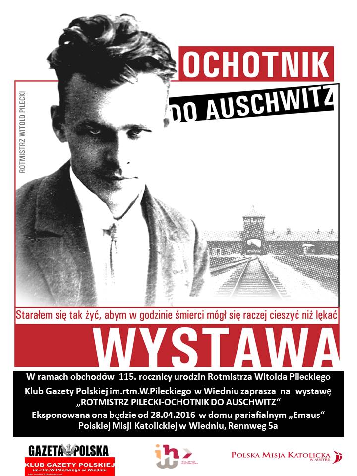 Z okazji 115. rocznicy urodzin oraz 68. rocznicy śmierci swojego patrona, KGP im. rtm. W. Pileckiego w Wiedniu, przy współpracy z wrocławską „Inicjatywą Historyczną” oraz Polską Misją Katolicką w Austrii, zaprezentuje w kilku miejscach Wiednia wystawę pt. „Rotmistrz Pilecki-Ochotnik do Auschwitz”. Pierwsza ekspozycja odbędzie się od 28 kwietnia do 13 maja br. w Centrum Pastoralnym „Emaus” Polskiej Misji Katolickiej w Wiedniu, przy ul. Strohgasse 24. Miejsca i terminy kolejnych ekspozycji będą podawane sukcesywnie.
