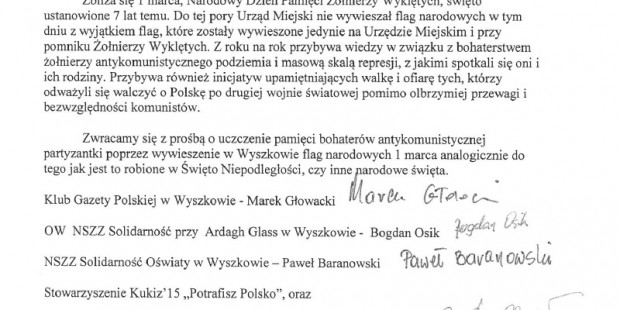 Wyszków: pismo do Burmistrza w sprawie wywieszenia flag w Święto 1 marca
