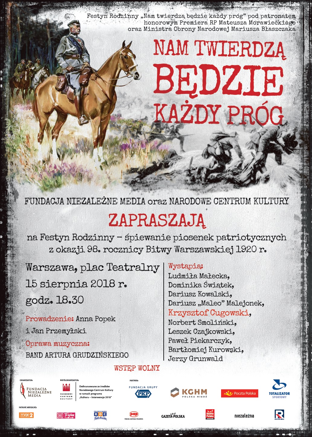 W dniu 15 sierpnia o godzinie 18:30 na Placu Teatralnym w Warszawie rozpocznie się Festyn Patriotyczny „Nam twierdzą będzie każdy próg” z okazji 98 rocznicy zwycięskiej Bitwy Warszawskiej 1920 roku pod Honorowym Patronatem Prezesa Rady Ministrów Mateusza Morawieckiego oraz Ministra Obrony Narodowej Mariusza Błaszczaka.