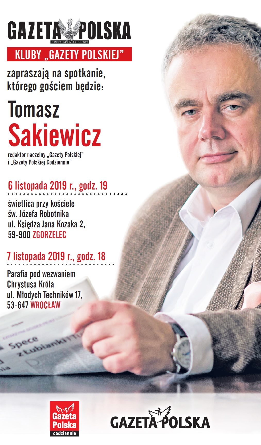 Klub „Gazety Polskiej” Zgorzelcu zaprasza na spotkanie z red. nacz. Tomaszem Sakiewiczem, 6 listopada, g. 19, świetlica przy kościele św. Józefa Robotnika, ul. Księdza Jana Kozaka 2.