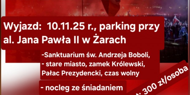 Klub GP ŻARY organizuje grupowy wyjazd z Żar na Marsz Niepodległości do Warszawy, w terminie 10-11 listopad 2025 r. Serdecznie zapraszamy.