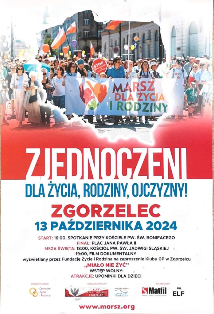 Zgorzelecki Klub Gazety Polskiej oraz Stowarzyszenie „Jest takie miejsce – Zgorzelec” zapraszają na „Marsz dla Życia, Rodziny, Ojczyzny”, który odbędzie się w Zgorzelcu, 13 października.