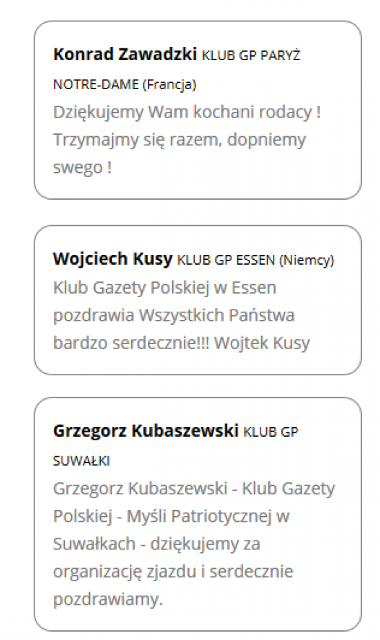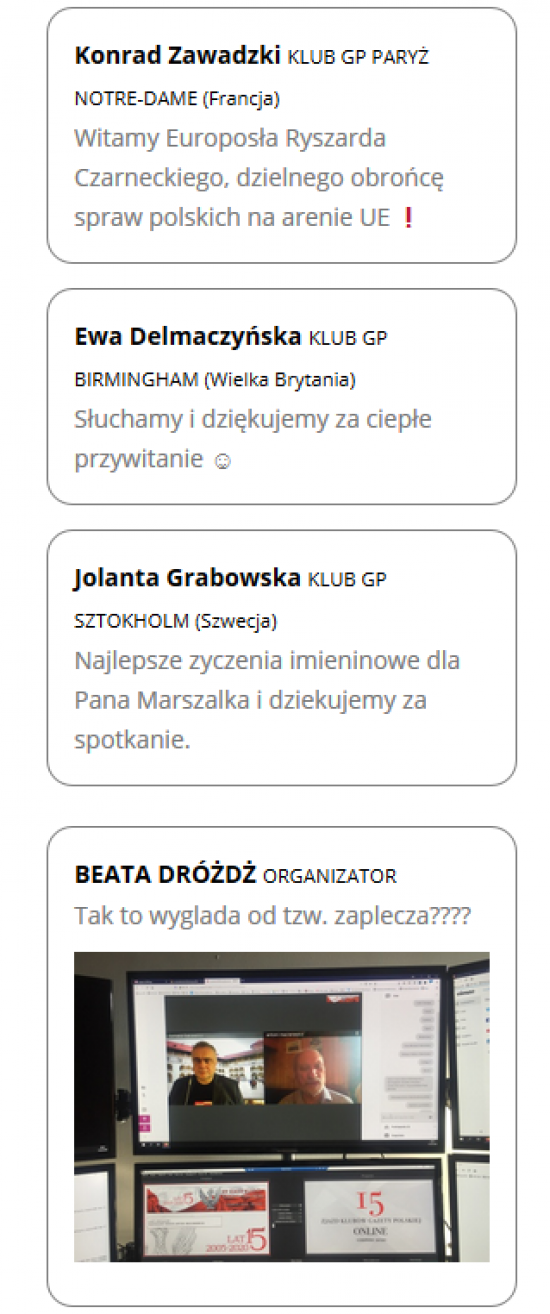 Faktycznie, po zalogowaniu do panelu można prześledzić wiele dyskusji pomiędzy przedstawicielami poszczególnych Klubów Gazety Polskiej. Przykładowo podczas koncertu Pawła Piekarczyka rozmawiali ze sobą członkowie Klubów GP ze Starogardu Gdańskiego, Wiednia i z amerykańskiej Filadelfii. Wszystkim podobał się koncert Piekarczyka. Rozmawiają ze sobą także mieszkańcy innych polskich miast czy zagranicy (m.in. Szwecja, Niemcy).