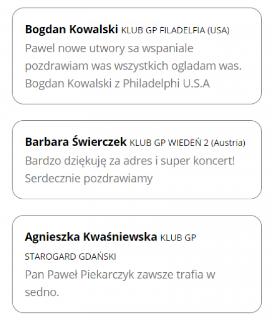 W panelu pisał z nimi sam Piekarczyk, któremu Bogdan Kowalski z USA przekazał, że jego nowe utworzy są wspaniałe. „Pan Paweł Piekarczyk zawsze trafia w sedno” – dodała Agnieszka Kwaśniewska z KGP w Starogardzie Gdańskim.